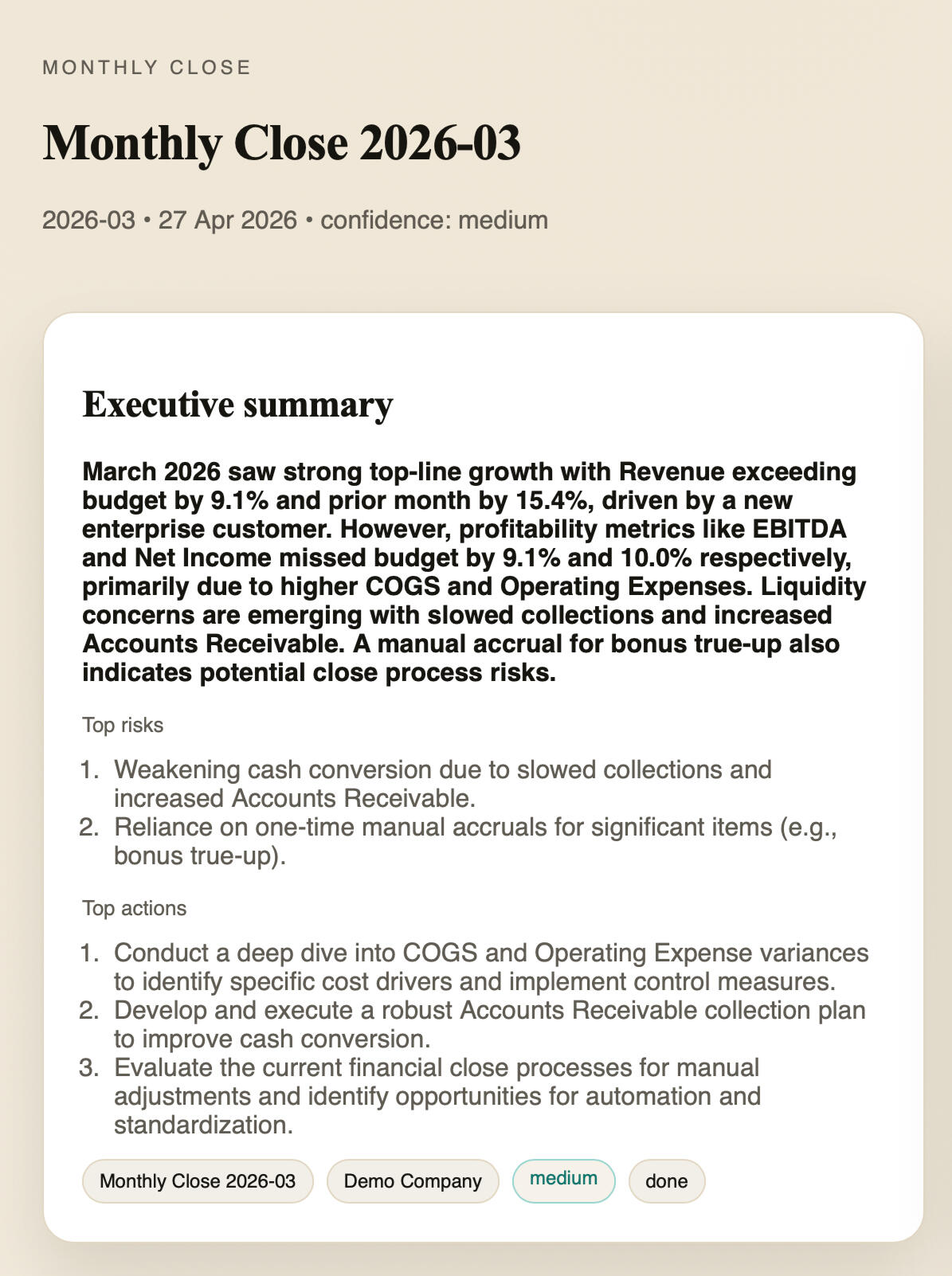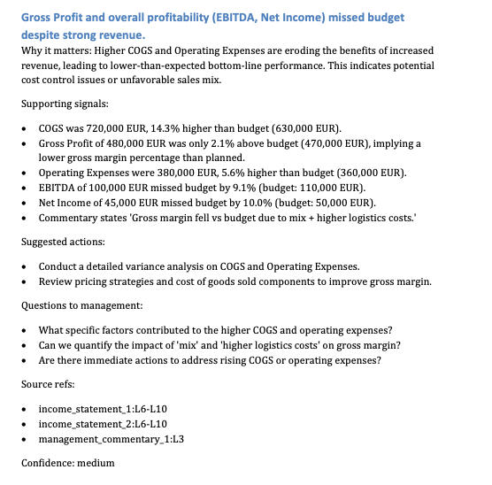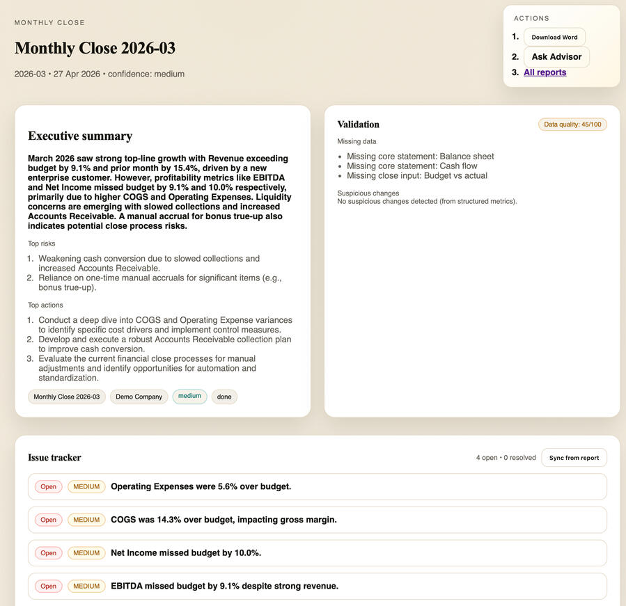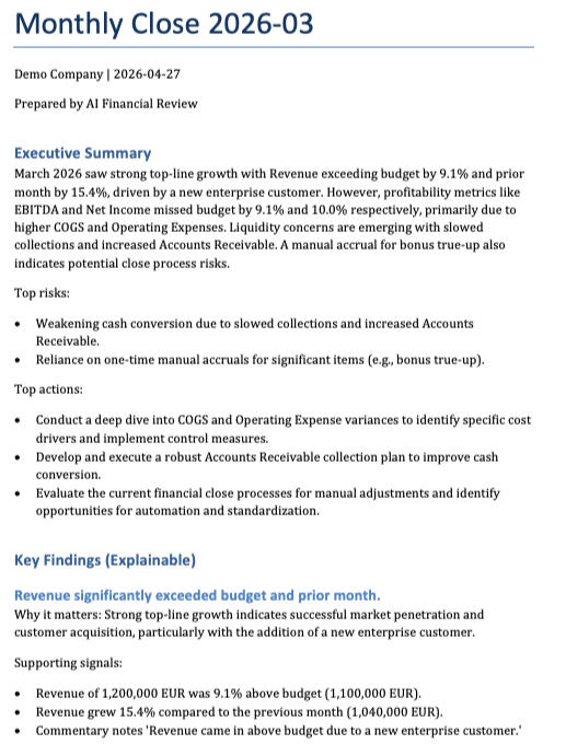 AI-powered financial review with clear issues, risks and actions